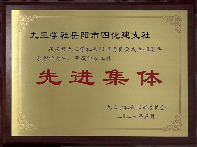5月29日,在慶祝九三學(xué)社岳陽市委員會成立40周年表彰活動中,九三學(xué)社四化建支社獲評組織工作先進(jìn)集體。