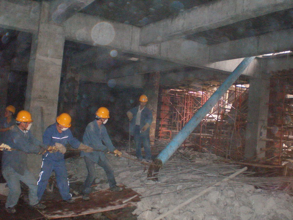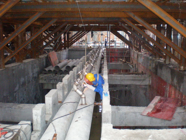 針對(duì)作業(yè)面在地下負(fù)二層,光線較差、通風(fēng)不暢,同時(shí)土建單位正在拆除臨時(shí)支撐,施工現(xiàn)場(chǎng)工作環(huán)境相當(dāng)惡劣等情況。為保證現(xiàn)場(chǎng)施工正常有序的進(jìn)行和施工人員身體健康,項(xiàng)目部采取相應(yīng)措施保證了整個(gè)現(xiàn)場(chǎng)的安全、照明、通風(fēng)。施工人員發(fā)揚(yáng)四化建吃苦耐勞、敢打敢拼的精神,長(zhǎng)期冒雨作業(yè)。吊裝中有吊機(jī)運(yùn)行不到的地方,就積極開(kāi)動(dòng)腦筋,用技巧、經(jīng)驗(yàn)和人力,保證前期設(shè)備及管道的吊裝倒運(yùn),為后期的施工做好了良好的鋪墊。