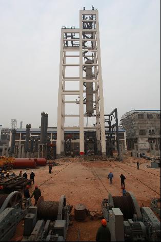 由一處承建的金象18·30合成裝置區(qū)合成氨裝置/醇烷化及氨合成工序需就位靜設(shè)備31臺(tái),就位體積最大、重量最重、吊裝難度最大的要算氨合成塔這個(gè)龐然大物了,氨合成塔自重390噸,高25米,是山西金象煤化工有限責(zé)任公司18萬(wàn)噸合成氨/30萬(wàn)噸尿素工程(簡(jiǎn)稱(chēng)18·30工程)兩大主體形象工程之一。