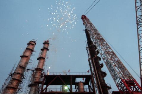 此次吊裝采用1000噸履帶吊,吊裝設(shè)備重達(dá)478噸、長(zhǎng)達(dá)65米,吊裝作業(yè)環(huán)境狹窄;再加上吊裝前幾日連續(xù)大雨造成的嚴(yán)重積水,使得此次吊裝工作面臨巨大的難題。在項(xiàng)目部起重負(fù)責(zé)人劉繼蓀的協(xié)調(diào)指揮下,吊裝工作經(jīng)歷了4個(gè)半小時(shí)的奮戰(zhàn)后,終于成功安裝就位。這標(biāo)志著兗礦新疆煤化工有限公司整個(gè)工程最大的合成塔在經(jīng)歷了四個(gè)月的艱苦努力后順利安裝成功。同時(shí)也標(biāo)志著我項(xiàng)目的大件設(shè)備吊裝進(jìn)入掃尾階段,安裝工程開始逐步向單體試車邁入。
