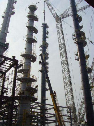 這次惠生大型設(shè)備的吊裝創(chuàng)造了目前公司吊裝史上的五個之最,即成功吊裝最高的塔(硫化氫濃縮塔高81.2m),成功吊裝最重的塔(甲醇洗滌塔重350t),使用的吊車規(guī)格最大(1250t吊車),最先采用鋼結(jié)構(gòu)模塊安裝,最大規(guī)模的一次大型設(shè)備吊裝。