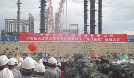 年產(chǎn)20億立方天然氣的伊犁新天項(xiàng)目由山東新汶礦業(yè)集團(tuán)投資興建,中國化學(xué)工程股份有限公司實(shí)行EPC總承包。目前工程已進(jìn)入土建向安裝過渡的關(guān)鍵時(shí)期,全面完成今年安裝施工任務(wù)是保證工程實(shí)現(xiàn)2014年6月30日機(jī)械竣工的前提。適逢新疆施工黃金季節(jié),總承包項(xiàng)目適時(shí)吹響了 “百日會戰(zhàn)”的號角。
