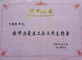 9月30日,在岳陽(yáng)市總工會(huì)召開(kāi)的第六屆代表大會(huì)上傳出喜訊。公司工會(huì)榮獲“岳陽(yáng)市先進(jìn)基層工會(huì)”,公司黨委書(shū)記、董事長(zhǎng)劉德輝被岳陽(yáng)市總工會(huì)授予“岳陽(yáng)市最佳工會(huì)工作支持者”榮譽(yù)稱號(hào),公司楊艷被岳陽(yáng)市總工會(huì)授予“岳陽(yáng)市優(yōu)秀工會(huì)工作者”榮譽(yù)稱號(hào)。