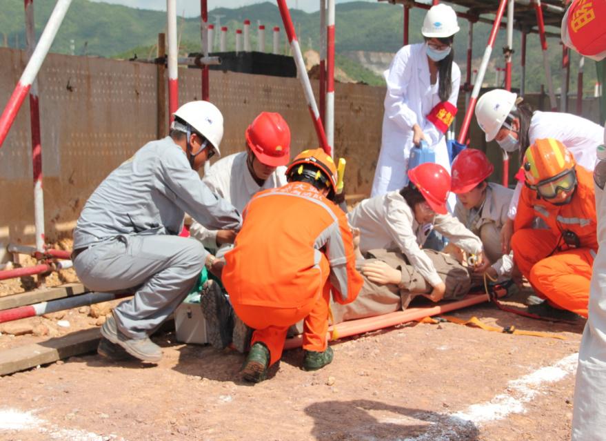 演練場景為硫磺庫棚東側(cè)腳手架有一人在約4米高處觸電后從高處墜落。發(fā)現(xiàn)事故后,項目部安全監(jiān)護人員及時上報,現(xiàn)場專職安全員劉占洋撥打救援電話,并上報應(yīng)急總指揮??傊笓]齊少華啟動項目部“1號應(yīng)急預(yù)案”。應(yīng)急救援組李小蘭、王亞萌等進行傷者救護,安全保障組張小民組織緊急集合,后勤保障組彭井恩帶隊進行警戒圍護,季信軍、高鐵騎救護車輛指引。應(yīng)急小組分工明確,各司其職,救援、警戒、緊急集合同時進行,傷者救護在10分鐘內(nèi)將傷者送往醫(yī)院救治。