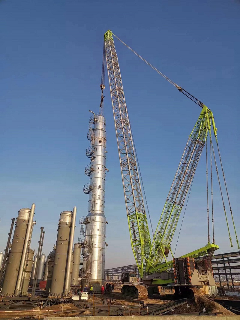 該甲醛吸收塔直徑 4.4米、高74米、重118噸,是該項目現(xiàn)場最大、最重設備。在吊裝中,項目施工人員采用抬運法,即以265噸履帶吊為主吊,180噸履帶吊輔助,兩輛吊車相互配合、緊密協(xié)作,順利完成甲醛吸收塔吊裝。