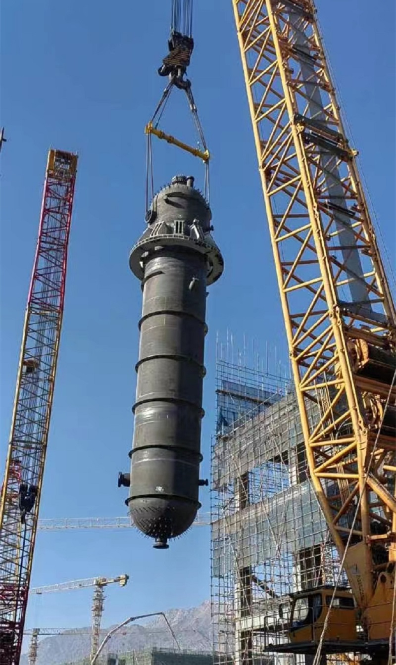 該反應器直徑4米、高27.4米、重287噸。為確保安全順利完成此次吊裝,項目部精心編制、優(yōu)化吊裝方案,在吊裝中采用“雙機抬吊遞送法”,即以1600噸履帶吊主吊和450噸履帶吊溜尾,一次性完成冷氫化反應器吊裝。