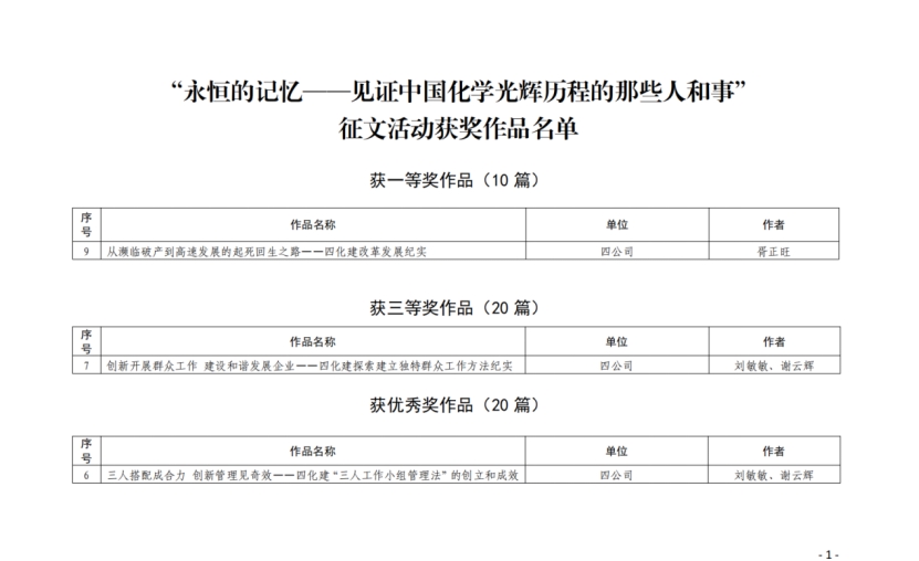2020年3月以來,集團(tuán)公司組織開展了“永恒的記憶——見證中國化學(xué)光輝歷程的那些人和事”征文活動。該活動得到了公司職工的積極響應(yīng),共向集團(tuán)上報(bào)8篇征文作品。其中由公司工會主席胥正旺撰寫的征文《從瀕臨破產(chǎn)到高速發(fā)展的起死回生之路——四化建改革發(fā)展紀(jì)實(shí)》榮獲一等獎,由公司黨群工作部主任劉敏敏、《四化建簡報(bào)》執(zhí)行主編謝云輝共同撰寫的征文《創(chuàng)新開展群眾工作 建設(shè)和諧發(fā)展企業(yè)——四化建探索建立獨(dú)特群眾工作方法紀(jì)實(shí)》《三人搭配成合力 創(chuàng)新管理見奇效——四化建“三人工作小組管理法”的創(chuàng)立和成效》分別榮獲三等獎和優(yōu)秀獎,并先后在中國化學(xué)微信公眾號和《中國化學(xué)報(bào)》刊登。