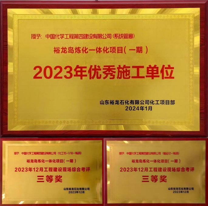 近日,公司山東裕龍石化項目部獲評山東裕龍石化有限公司2023年優(yōu)秀施工單位,項目化工15-1/16-1標段和儲運12-1標段在山東裕龍石化有限公司2023年12月工程建設現(xiàn)場綜合考評中分別獲三等獎。