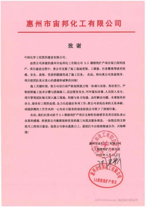 近日,公司收到惠州市宙邦化工有限公司發(fā)來(lái)的致謝信,信中對(duì)公司圓滿完成惠州市宙邦化工有限公司3.5期溶劑擴(kuò)產(chǎn)項(xiàng)目施工任務(wù)表示衷心感謝。