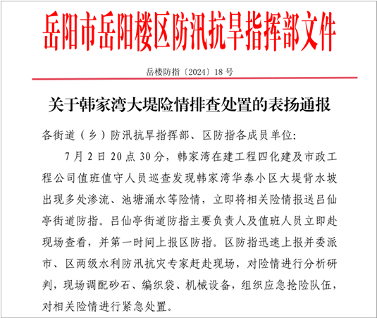 7月5日,岳陽市委常委、常務(wù)副市長(zhǎng)李建華到項(xiàng)目現(xiàn)場(chǎng)督導(dǎo)防汛工作,對(duì)公司前段防汛工作給予充分肯定。同日,岳陽市岳陽樓區(qū)防汛抗旱指揮部發(fā)來通報(bào),對(duì)項(xiàng)目部精心組織、及時(shí)處置,確保管涌險(xiǎn)情得到有效控制予以表揚(yáng),并對(duì)喻希陽予以嘉獎(jiǎng)。