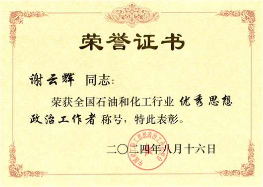 謝云輝獲評(píng)全國石油和化學(xué)工業(yè)優(yōu)秀思想政治工作者