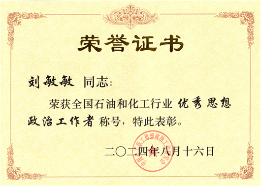 劉敏敏獲評(píng)全國石油和化學(xué)工業(yè)優(yōu)秀思想政治工作者