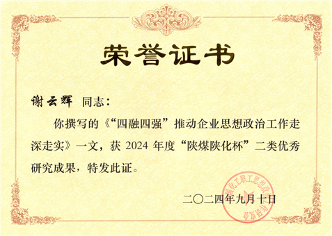 謝云輝撰寫的政研論文獲評(píng)2024年度“陜煤陜化杯”二類優(yōu)秀成果