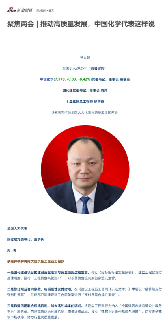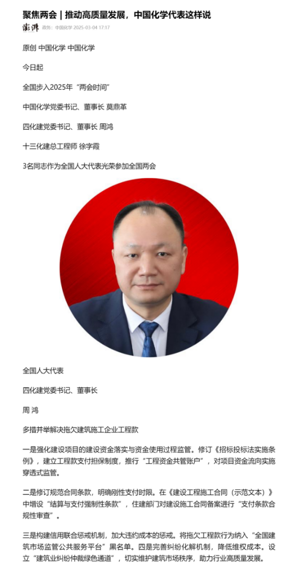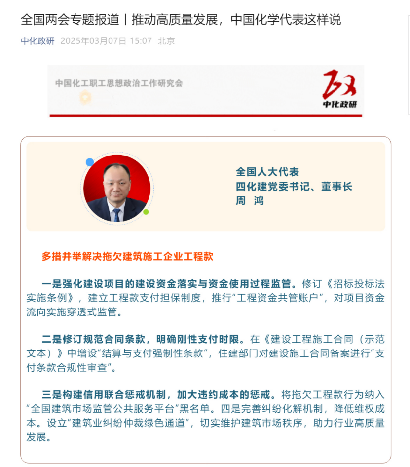 2025年全國兩會期間,全國人大代表,中國化學(xué)四化建黨委書記、董事長周鴻向大會提交《關(guān)于加強產(chǎn)業(yè)工人隊伍建設(shè)的建議》《關(guān)于多措并舉解決拖欠建筑施工企業(yè)工程款的建議》《關(guān)于推動洞庭湖區(qū)常岳九鐵路、荊岳鐵路、監(jiān)利至華容至益陽鐵路規(guī)劃建設(shè)提速的建議》《關(guān)于修改最高法院〈關(guān)于大型企業(yè)與中小企業(yè)約定以第三方支付款項為付款前提條款效力問題的批復(fù)〉的建議》等4條建議,受到主流媒體深入報道,引起社會各界廣泛關(guān)注。