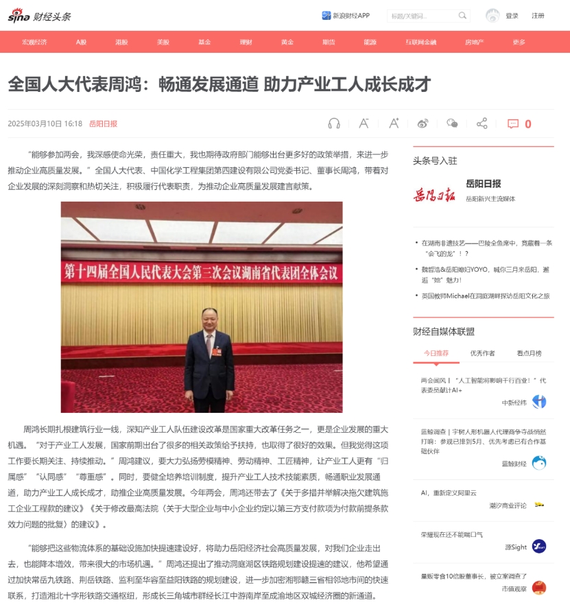 3月10日,岳陽日報·岳陽發(fā)布微信公眾號以“全國人大代表周鴻:暢通發(fā)展通道 助力產(chǎn)業(yè)工人成長成才”為題報道周鴻參加2025年全國兩會。