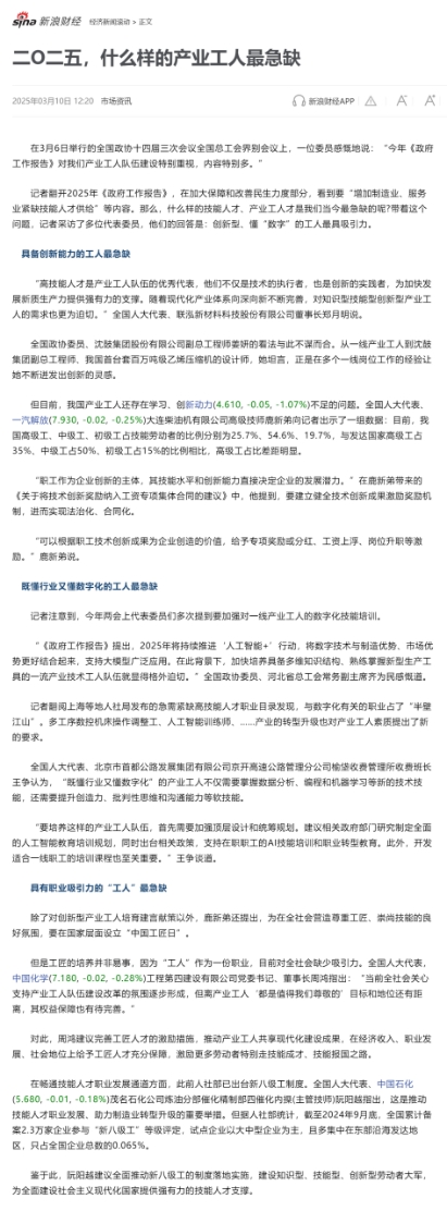 3月10日,新浪網(wǎng)以《二O二五,什么樣的產(chǎn)業(yè)工人最急缺》為題報道周鴻的建議。