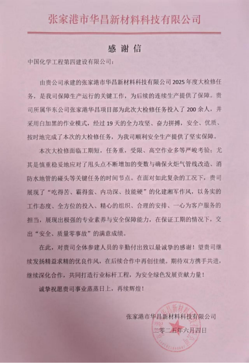 近日,江蘇華昌新材料科技有限公司向公司發(fā)來(lái)感謝信,對(duì)華東公司在張家港華昌2025年度零星維修及技改技措項(xiàng)目大檢修中的突出表現(xiàn)給予高度贊揚(yáng)和衷心感謝。