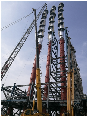 這3臺(tái)精餾塔是精餾裝置區(qū)的主要設(shè)備,塔高92.5米,是該工程中起吊高度最高,安裝難度最大,以及危險(xiǎn)性最大的施工作業(yè)。為了確保一次順利將這3臺(tái)超高設(shè)備吊裝成功,分公司施工人員精心設(shè)計(jì)分兩段吊裝,先將3臺(tái)塔的下段依次吊裝就位并安裝完成,然后再進(jìn)行上段的吊裝。在塔體上段的安裝過(guò)程中,因塔體太高,現(xiàn)場(chǎng)風(fēng)力、溫度等環(huán)境因素的變化會(huì)大幅度影響塔體的垂直度,項(xiàng)目部技術(shù)人員詳細(xì)考慮各種影響因素,密切關(guān)注現(xiàn)場(chǎng)環(huán)境與塔體的垂直度情況,一次準(zhǔn)確順利將這3臺(tái)超高設(shè)備吊裝就位。