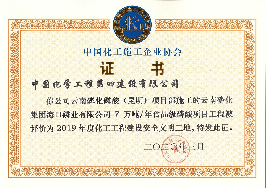 5月21日,西南分公司收到中國化工施工企業(yè)協(xié)會頒發(fā)的云南磷化海口磷業(yè)有限公司7萬噸/年食品級磷酸項(xiàng)目“2019年度化工工程建設(shè)安全文明工地”證書。
