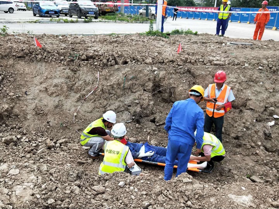 演練開始,現(xiàn)場人員向總指揮報告事故發(fā)生及人員被埋情況,并迅速安排各個救援小組分別進行救援。根據(jù)應(yīng)急預(yù)案,各應(yīng)急救援組成員收到救援命令后,立即投入到搶險救援工作中去。安保組安排人員封鎖道路,設(shè)專人指揮交通,保障現(xiàn)場救援通道暢通;技術(shù)保障組及時勘察事故實際情況,避免發(fā)生二次坍塌事故;物資保障組及時提供搶險救援物資;醫(yī)療組緊跟搶險組趕赴現(xiàn)場,迅速展開救援活動,將“獲救”人員用擔(dān)架抬至空曠地帶,進行初步包扎和搶救直至救護車到達。