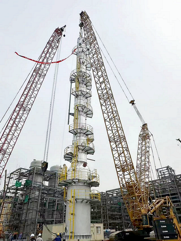 大連恒力項(xiàng)目苯酚丙酮裝置首臺“穿衣戴帽”塔器完成吊裝