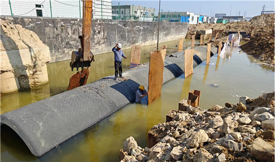 該雨水管道施工區(qū)域位于水下,管中線離海水僅有20米并與海相通,管道安裝難度大;同時,在開挖過程中,取水箱涵上面出現(xiàn)大量海水涌入導(dǎo)致土層坍塌。面對緊急情況,項目部連夜探討解決管道水中定位與對接問題,積極會商業(yè)主、監(jiān)理單位,積極探索解決問題的路徑和方法,最后決定因“水”制宜,采取水下澆注混凝土來解決此難點。施工人員在箱涵上方處,通過對預(yù)應(yīng)力鋼筒混凝土管兩端頭進(jìn)行預(yù)制管枕施工,淤泥層及碎石處采取預(yù)制閥板墊層,挖集水坑進(jìn)行強(qiáng)排,并且全程用GPS和全站儀進(jìn)行精確測量標(biāo)高和定位,確保雨水管道安裝的準(zhǔn)確性和穩(wěn)定性,順利完成管道水中施工作業(yè)。